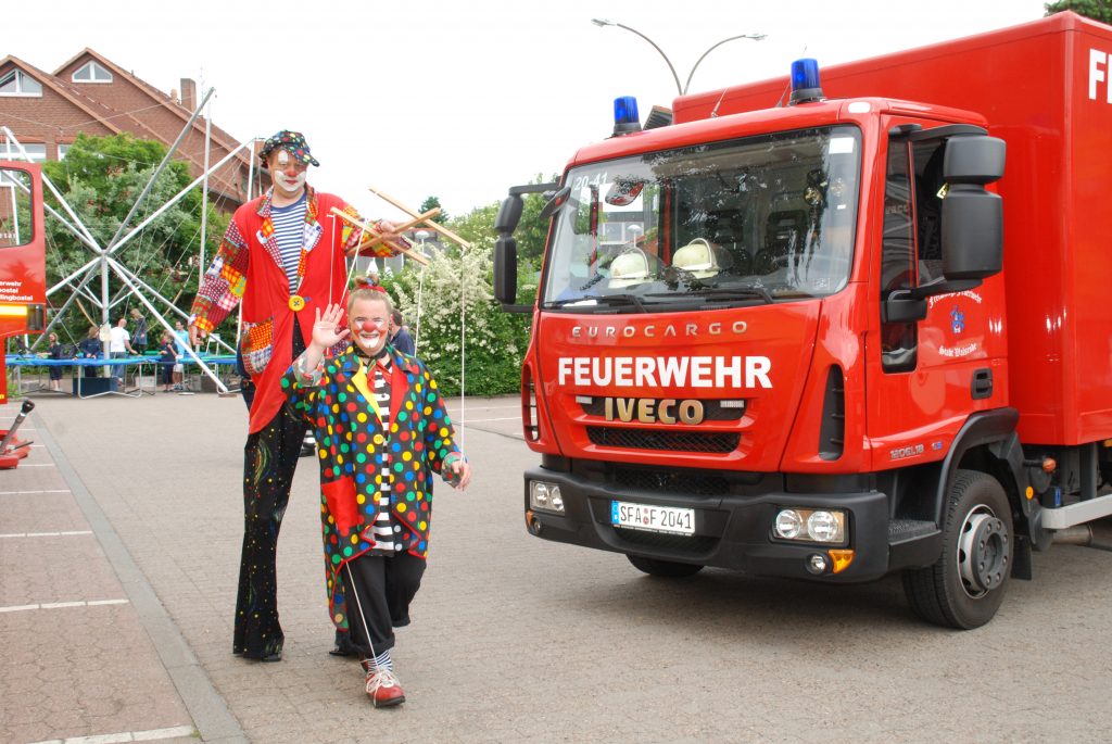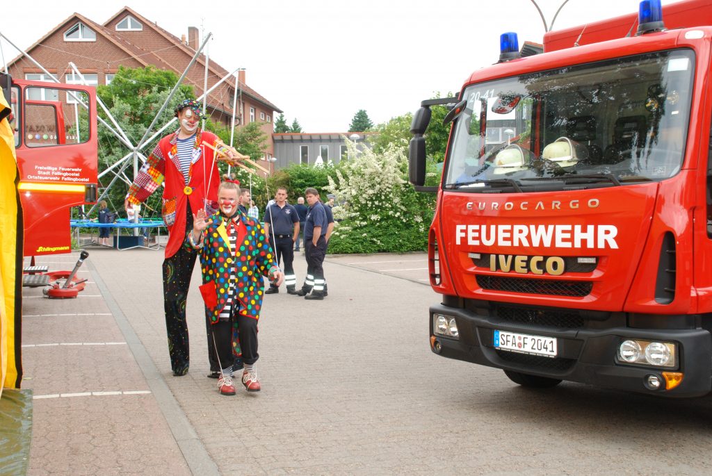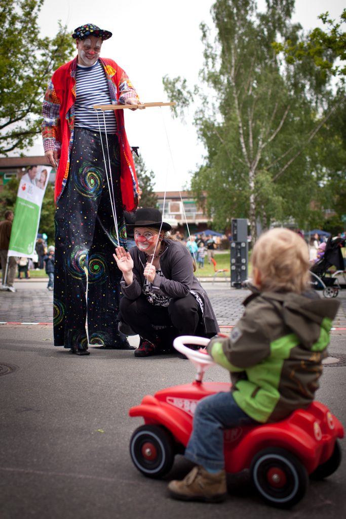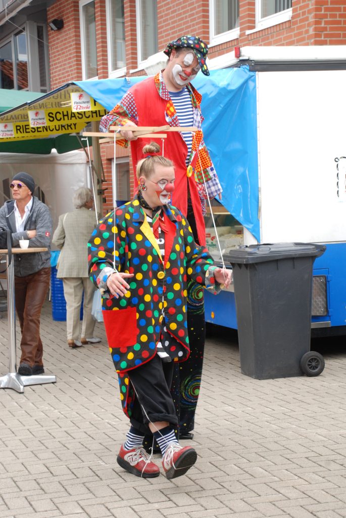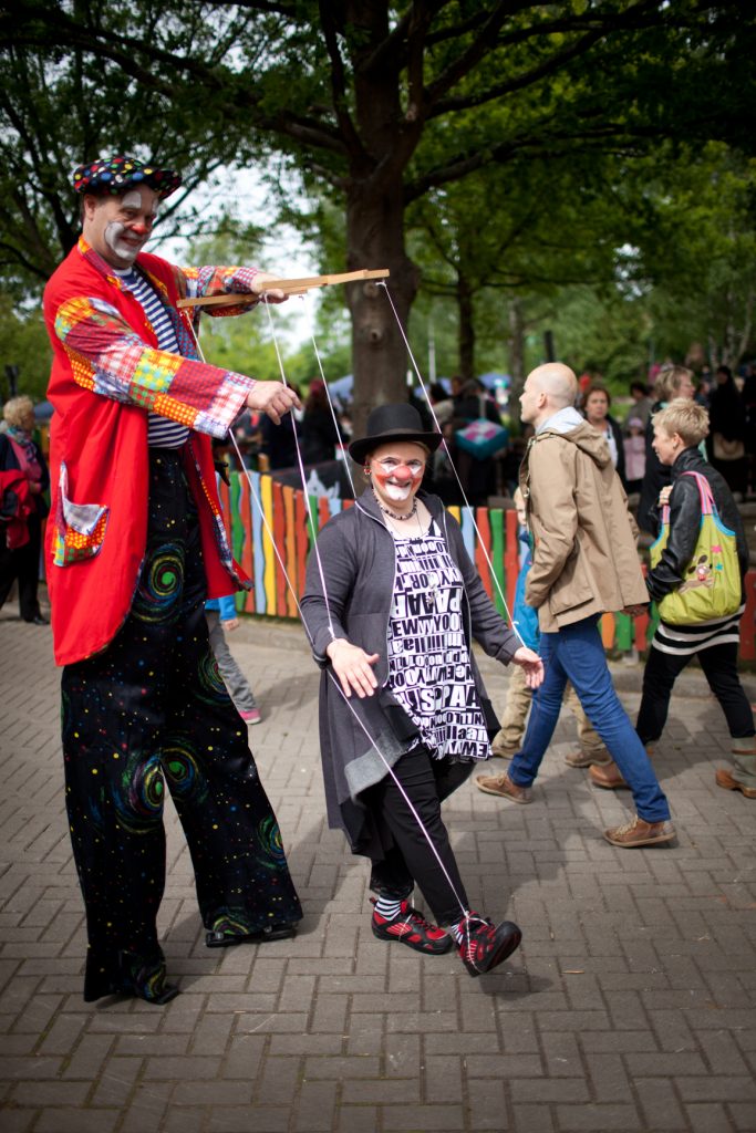 Clown Fidele ist auch mit Partner Clown Fidel buchbar als z. B. Puppenspieler auf Stelzen mit Marionette